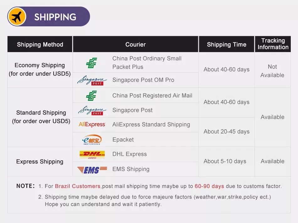 Packages from our warehouse in China will be shipped by ePacket or EMS depending on the weight and size of the product. Packages shipped from our US warehouse are shipped through USPS.