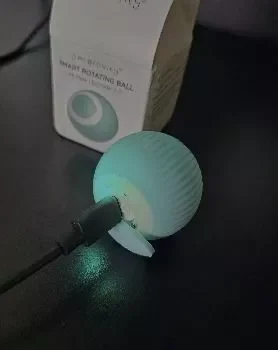 The ball was very good and everything arrived very quickly, it was recharged by USB so the box arrived somewhat touched but the ball that is the important thing arrived well, very happy with the purchase and my cat still liked it a lot, Has light while the ball moves changes color I recommend it is fine for the cat to play.