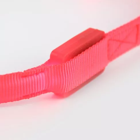 We have the green one and it is so excellent! Our labradoodle is the coolest dog at the dog park and all the owners constantly comment on the least and collar of the same color! Just charge up on the USB and press the button to indicate which level of "flash" you want and voila!