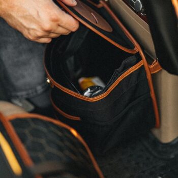 The trash can came in a beautiful package, perfect for a gift. Inside, there is double bottom with waterproof lining. Outside, there are pockets to store snacks, hand sanitizers or napkins. The attachment strap is long and made of durable textile. Overall, it’s a great accessory for your car, especially on the road with family or friends.